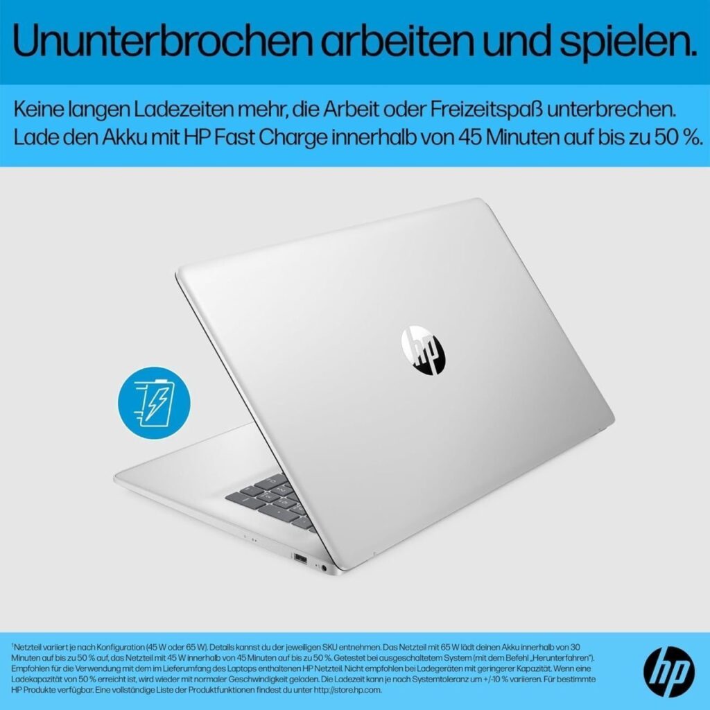 Beeindruckendes Full-HD-Display: Genießen Sie brillante Grafiken auf einem 17,3-Zoll-Display mit 1920 x 1080 Pixeln, schmalem Rahmen und Anti-Glare-Technologie für komfortables Arbeiten im Freien.Schnelles Laden und lange Akkulaufzeit: Mit HP Fast Charge ist Ihr Akku in nur 45 Minuten wieder zu 50 % geladen, sodass Sie sich auf Ihre Aufgaben konzentrieren können, ohne auf Steckdosen angewiesen zu sein.